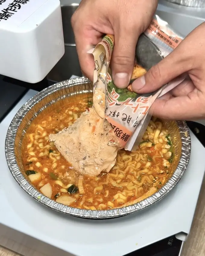 ▼若有加購的配料從冰箱裡拿取,雞胸肉要先微波喔!