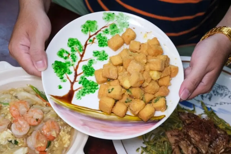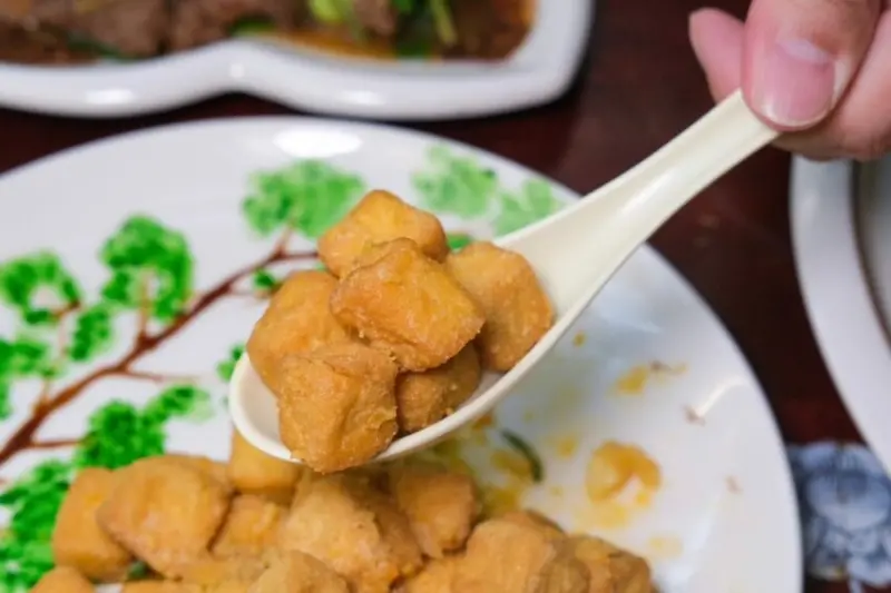 ▼金黃飽滿的誘人金沙豆腐,每一塊大小都切得剛剛好,外層裹上濃郁鹹香的金沙醬,咬下去帶來爆漿的軟嫩口感。