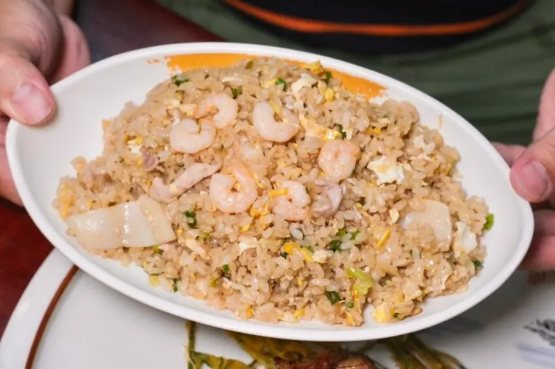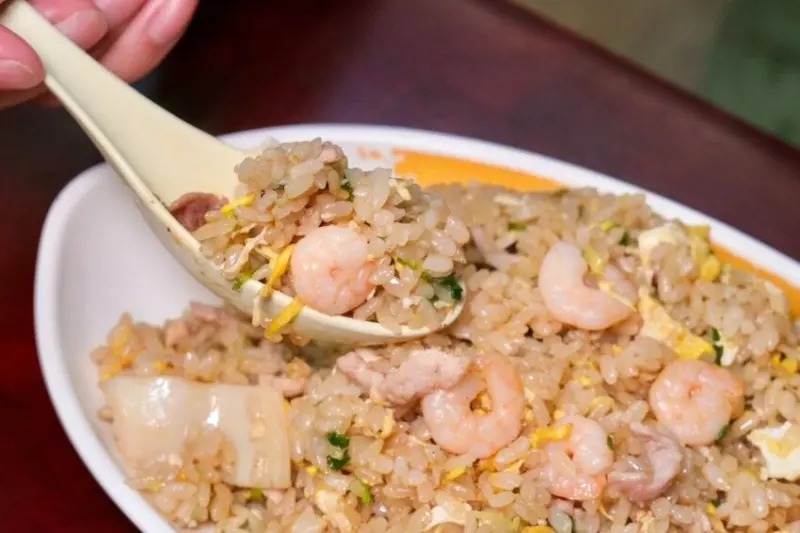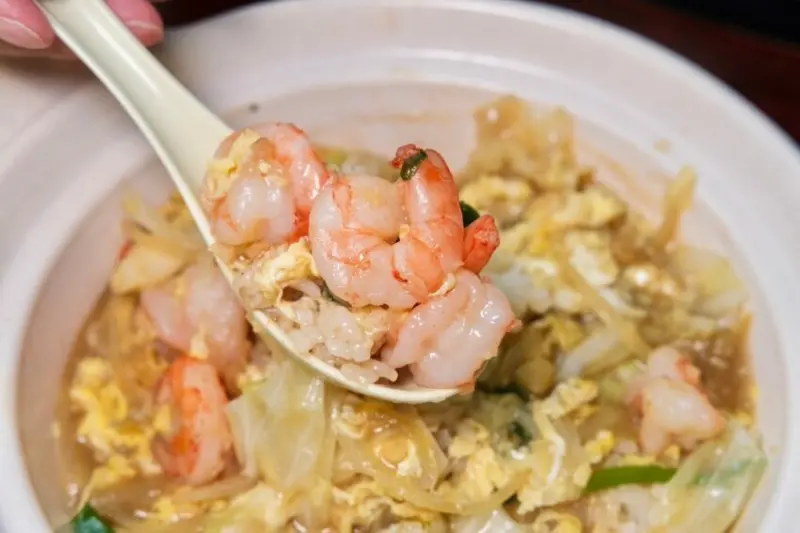 ▼主食推薦可以點它們家的蛋炒飯和燴飯,只要銅板價滿滿一大盤都是料,滑蛋蝦仁燴飯加入蝦仁、肉絲、雞蛋、洋蔥、蔥段等爆炒,還有祕密武器雞湯煨香,滑嫩中有著清爽鮮味超討喜,而我更愛這道綜合蛋炒飯,金黃飽滿粒粒分明,能吃到豬肉絲、花枝、蝦仁超豐盛。