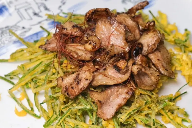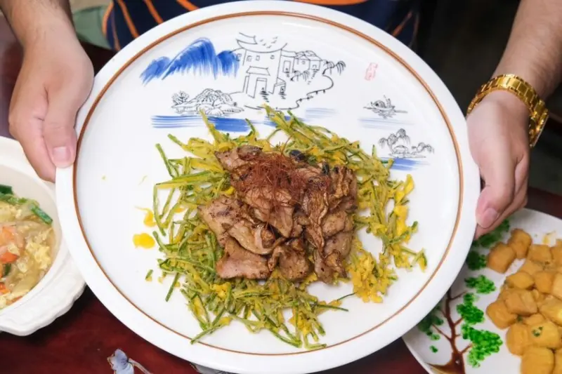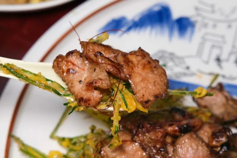 ▼老闆新研發的酥炸水蓮拼松阪,是上過電視節目的明星品項,從擺盤就能感受出滿滿用心,將水蓮炸到香酥脆口,頂頭放上炒到彈脆的松阪豬肉,Q彈又脆口的口感讓人難忘,推薦大家一定要試看看!