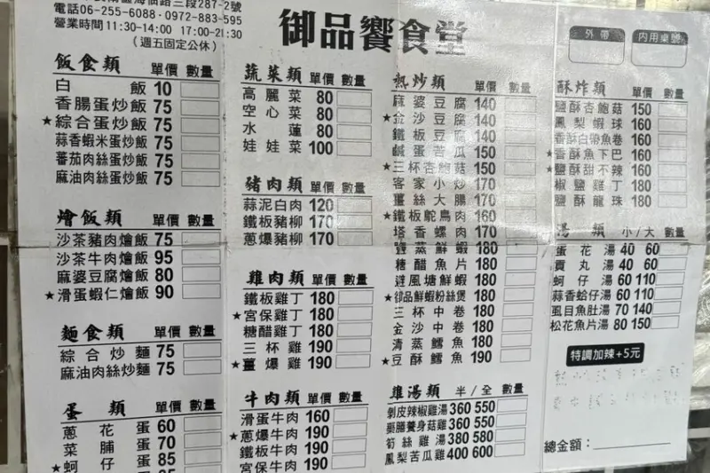 ▼【御品美食饗食堂】位於台南市安南區,鄰近四草綠色隧道和鹿耳門等景點,從外觀看起來不太起眼,但是許多在地老饕的愛店,開車可停放於附近的白線!