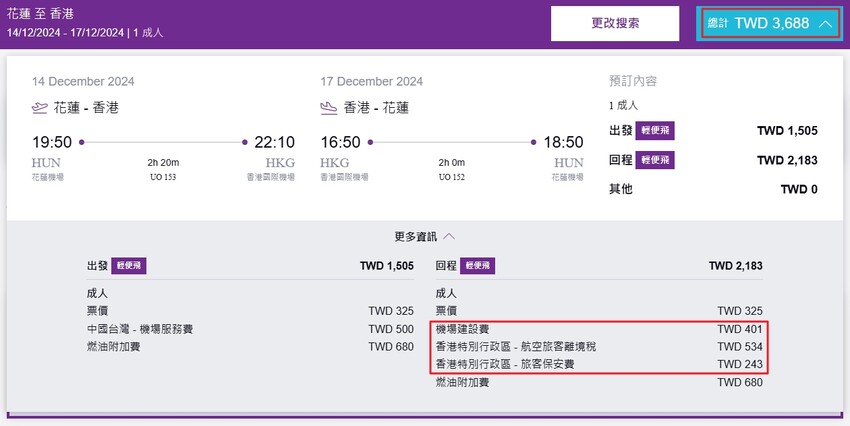 不過選擇完方案時要記得看最終價格,因為香港當地回程的費用跟一般廉航比較不同,會收像機場建設費還有旅客保安費,基本上加一加來回含稅最低也是3000多台幣,不過以廉航來說還是非常便宜
