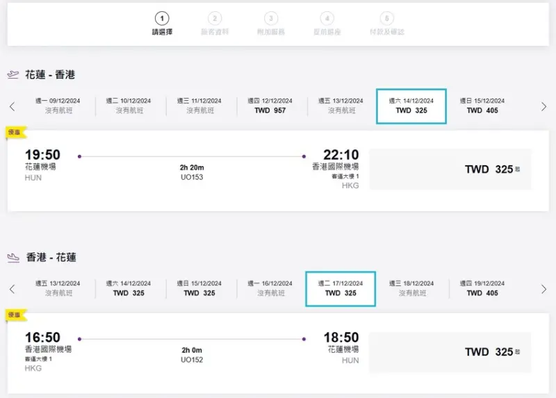 花蓮政府宣布,2024年12月12日起將恢復花蓮直飛香港的包機服務。由香港快運航空(HK Express)提供每周四班(週二、週四、週六、週日),每趟航班可搭載約180名旅客。最吸引人的是,香港快運在官網上提供單趟未稅最低 325元台幣 的優惠票價!