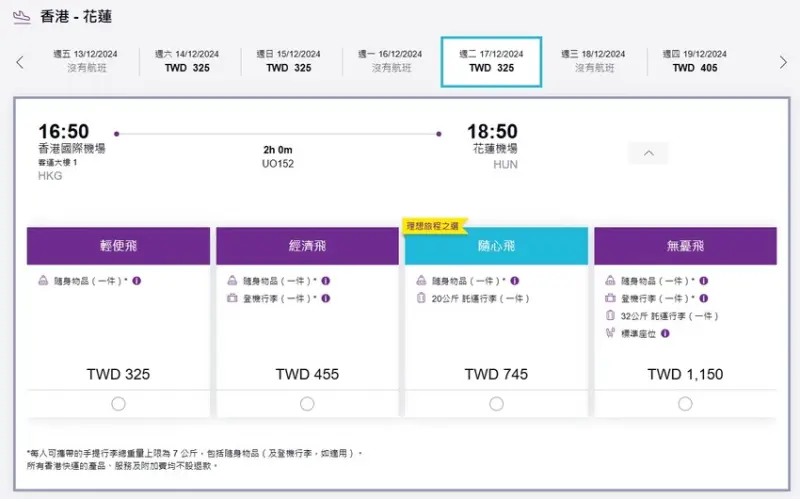 香港快運的票務選項有四種,最基本的方案適合輕便背包客,但若多加400元即可享有 20公斤托運行李,價格相當實惠。不過購票時要注意回程費用,香港出發需額外支付機場建設費與旅客保安費,加總後來回含稅最低約3000多元台幣,對廉航來說仍然是非常划算的選擇。