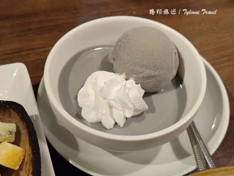 芝麻布丁+芝麻冰淇淋,芝麻布丁與冰淇淋搭配食用,芝麻的香氣濃郁卻不過於甜膩,濃厚的層次感讓人難以形容,是芝麻控的最愛!