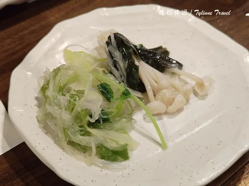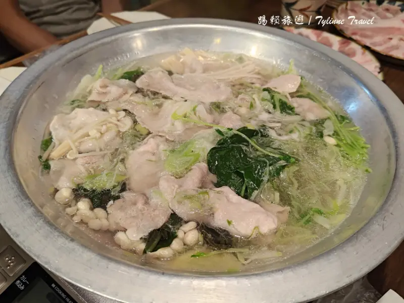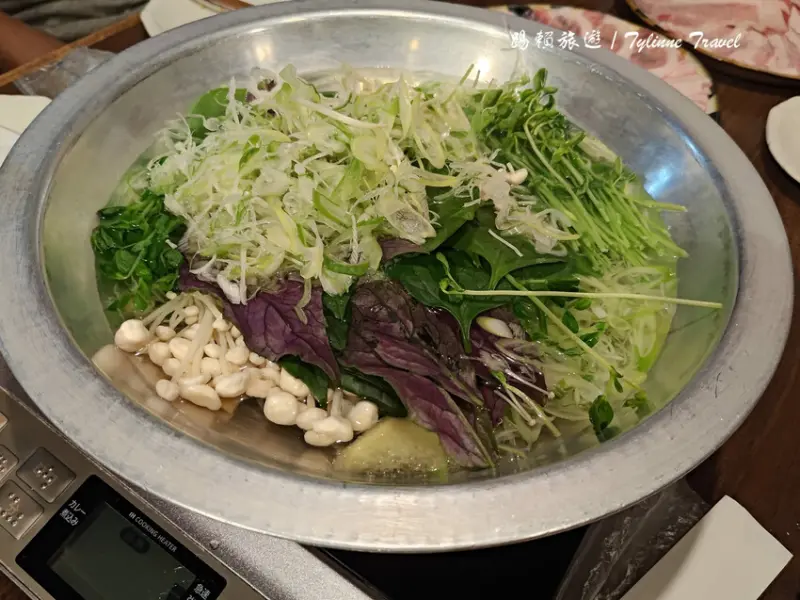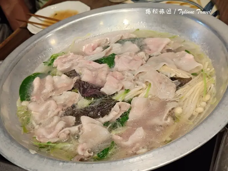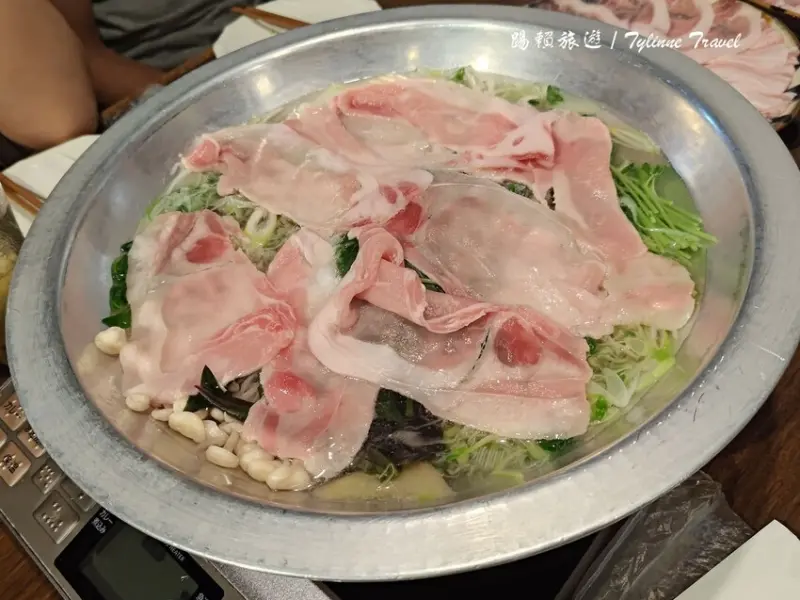 一大盤蔬菜搭配阿古豬肉片,圖片中呈現的是兩人份,如果是奇數人數點餐,店家依然會以偶數份上菜,例如三人點餐會上四人份的食材,份量十足。