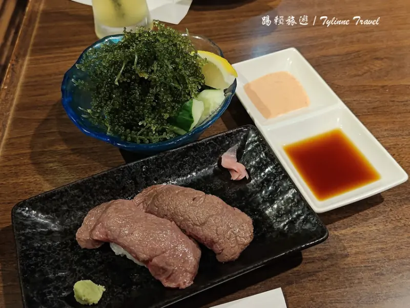 接著是店內的招牌之一「黑毛和牛握壽司」,也稱為本部牛握壽司,選用沖繩知名黑毛和牛製成。牛肉鮮嫩多汁,入口即化,搭配些許芥末,不僅解膩,還增添一份爽口的層次感。