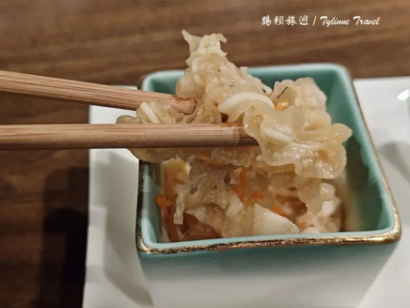 上桌的開胃菜有三樣,色香味俱全,每一道都讓人充滿驚喜,沖繩苦瓜,這次的苦瓜是涼拌方式,與一般炒苦瓜相比,多了一份清爽,苦味適中,帶著微微的甘甜。