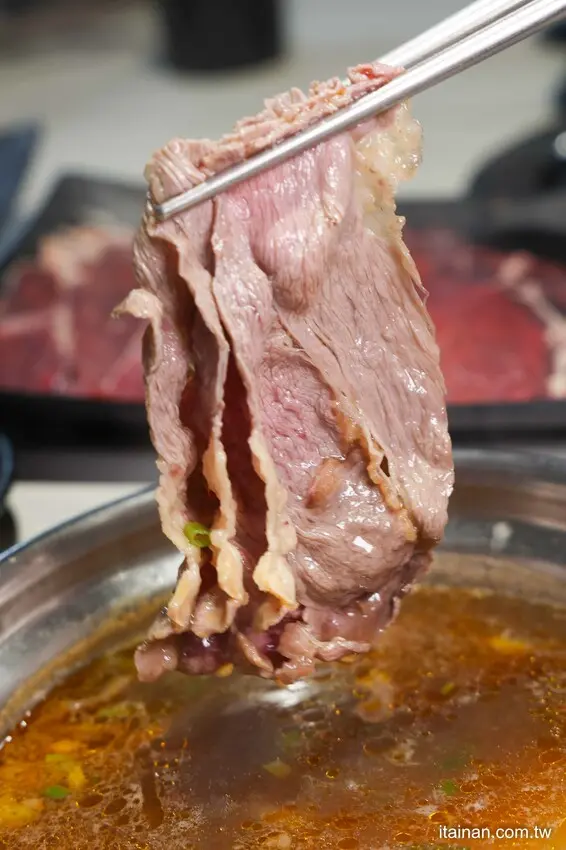 我們點的霜降牛,這塊肉剛好切面很大塊,所以每一片都是超大片,涮完吃起來就有大口吃肉的爽度。