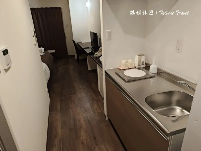 進房後,最先看到的就是小廚房,裡面有電磁爐、微波爐和一個大冰箱,這樣可以讓你在旅途中輕鬆自己煮點簡單的餐點。