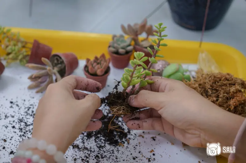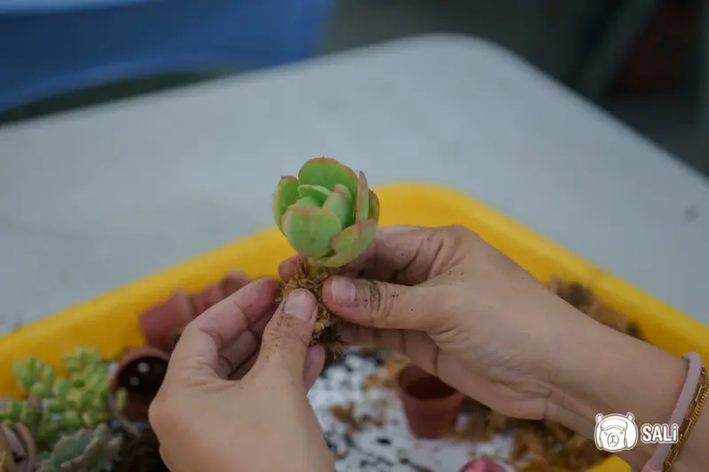 接著將多肉植物從盆栽中取出,把土壤撥開只留下植物的根
