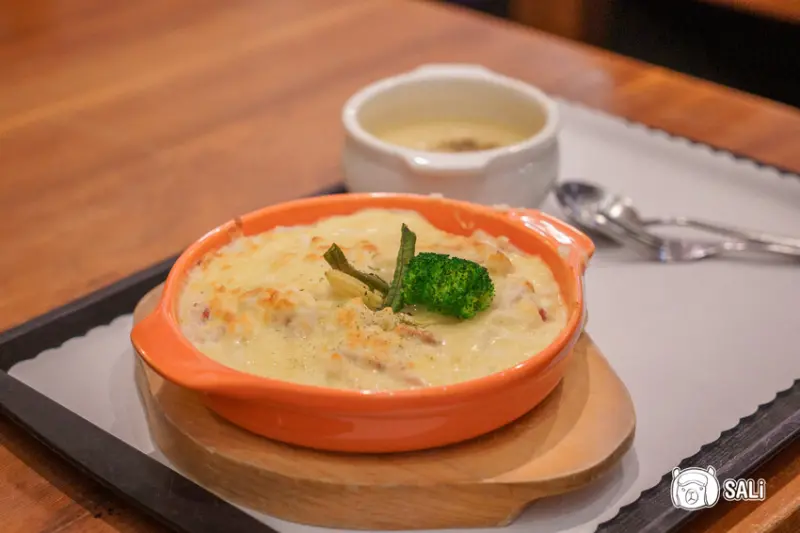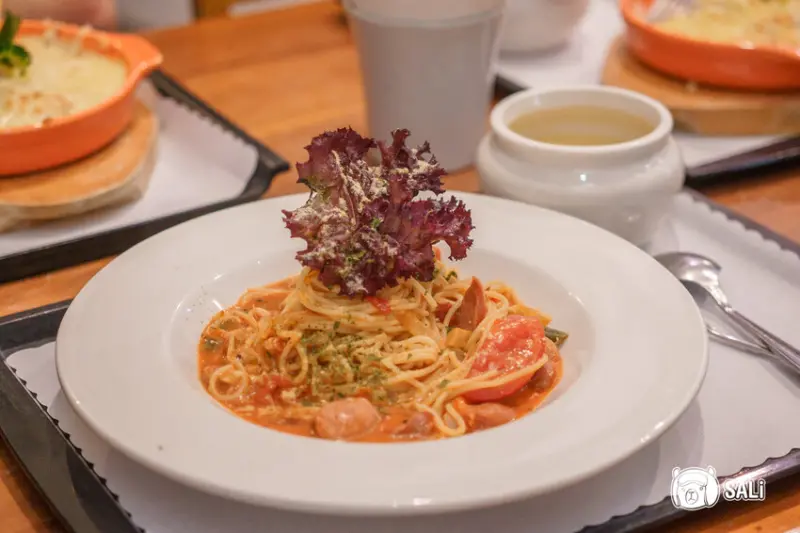 在宛如藝廊的用餐空間,用餐都覺得雅緻起來,這次品嘗燻雞焗烤燉飯及番茄義大利麵,以套餐形式呈現,附贈濃湯及飲品,風味表現有一定水準,份量也相當實在