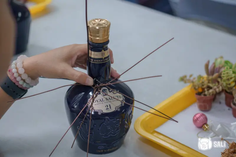 第一步驟將鋁絲凹折成適合角度,再用黏土固定在酒瓶上
