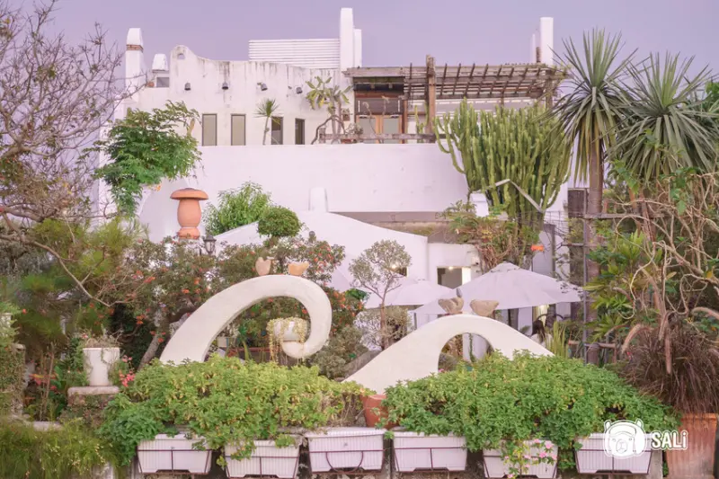 白色地中海風格的綠海咖啡,是田尾公園路上的異國浪漫。充滿藝術氣息鐵雕招牌由老闆親手設計,原為景觀設計與花木零售,於2008年轉型為庭園咖啡館,店內庭院造景有羅馬柱及花廊,營造優雅氛圍,老闆娘親自料理的特色餐點與咖啡,也很值得一嚐