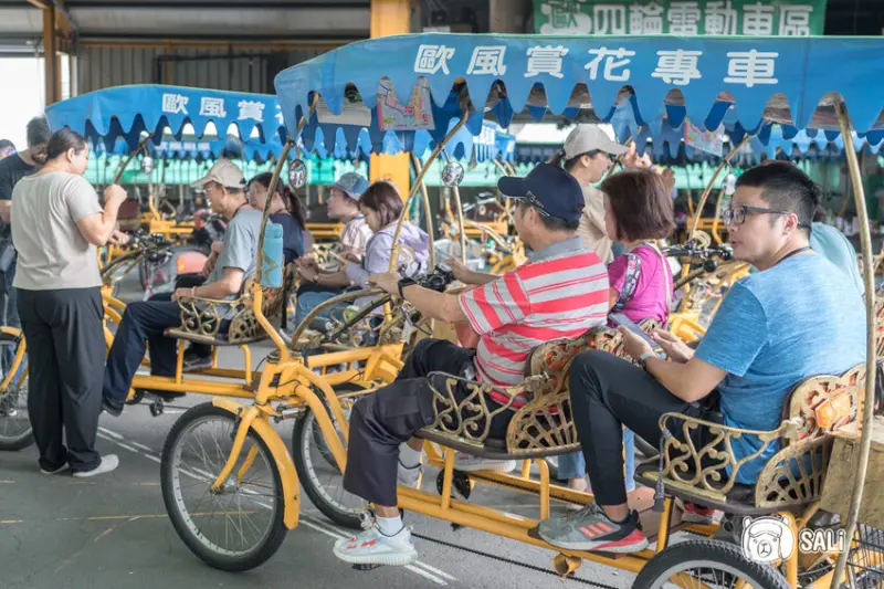 想悠遊田尾花卉一條街,最推薦移動方式,當然是騎協力車,自在地穿梭於園藝店和鄉間小徑!這次來「歐風租車」,從2005經營至今,共有兩間店面,這次選擇租借四輪電動車,能乘載四人,有遮陽棚,後方有置物籃,能擺放選購植栽或行李,恣意漫遊花田巷尾,輕鬆欣賞沿途風光