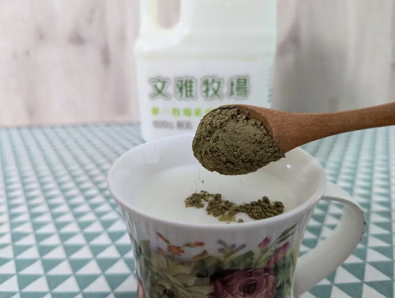 再將適量的抹茶粉加入裝有鮮乳的杯子中