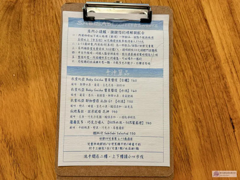 SabiSabi 的菜單包含手沖咖啡、一般咖啡、飲品以及手作甜點,價位大約在100元到180元之間,內用每人低消為一杯飲品,還有甜點組合可以選擇。這裡的手作甜點選擇豐富,尤其是肉桂捲,更是許多老饕推薦的必點美食。