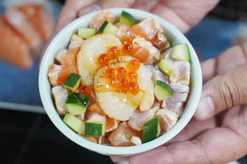 完全是迷你版的散壽司,好多生魚片丁、還有炙燒干貝