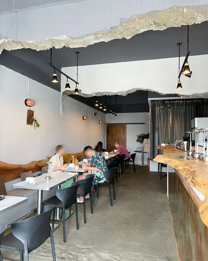 牆壁的上部呈現不規則的天然石紋狀細節,彷彿岩洞般的設計,增添了粗獷的自然氛圍。吧檯區用木質台面打造,具有不規則的邊緣,強調自然的粗糙美感,呼應了牆壁的岩石造型。整體呈現了一種舒適且具有自然氛圍的現代風格。