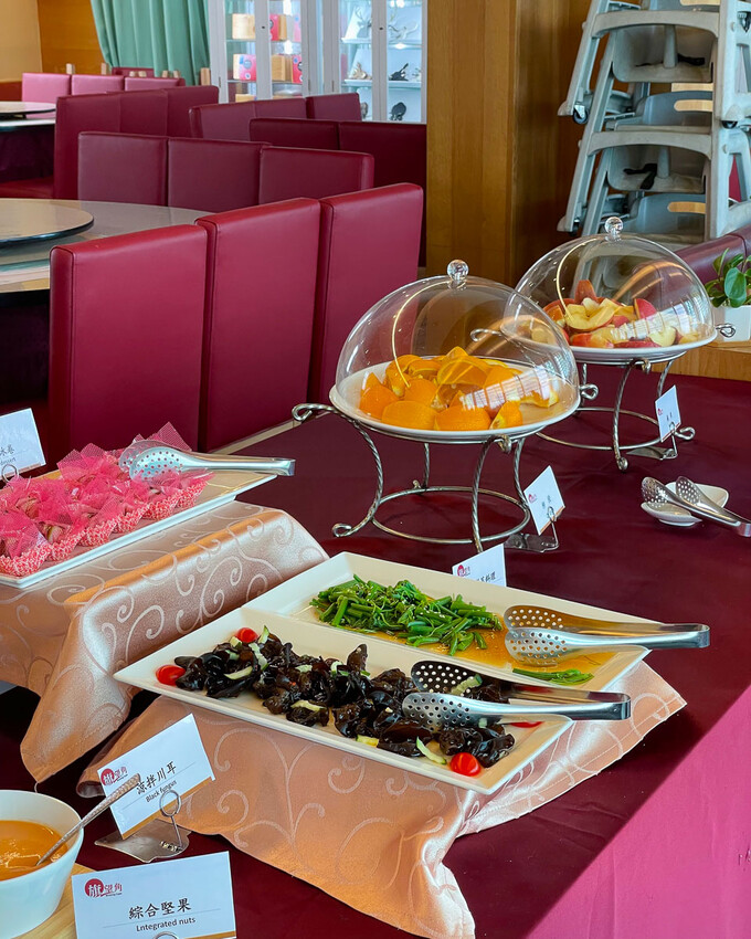多種傳統中式早餐選擇,如炒麵、炒飯、饅頭、包子和燒賣。還有粥品搭配各種小菜。西式早餐區域有豐富的選擇,包括各式麵包,多種果醬、奶油和蜂蜜。還有現場烹調的煎蛋、炒蛋。