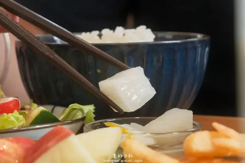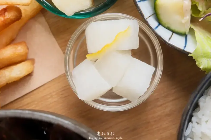 配菜中的醃漬白蘿蔔酸爽開胃,對於稍重口味的麻婆豆腐來說,是很好的解膩搭配。