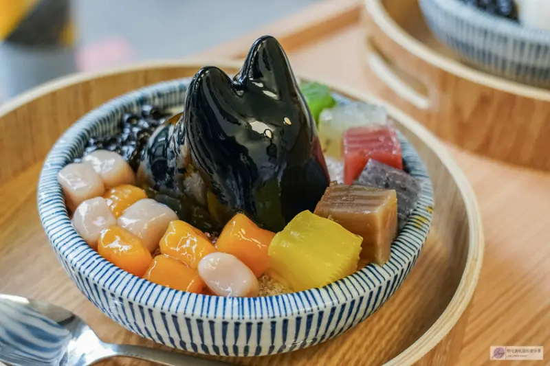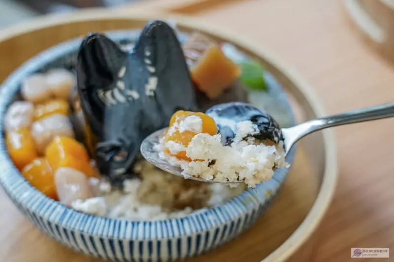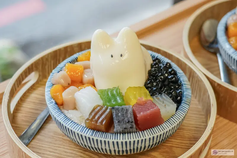 拿到手真的讓少女心爆發!小朋友看到肯定也會很喜歡。這隻白色的兔兔是奶凍兔,口感帶有淡淡椰奶香,入口滑順香甜,一旁配有七彩粉粿、珍珠和芋圓,整碗看起來超級繽紛可愛。底層是黑糖刨冰,友人有請店員幫忙減糖,所以甜度剛剛好,吃起來清爽不膩。