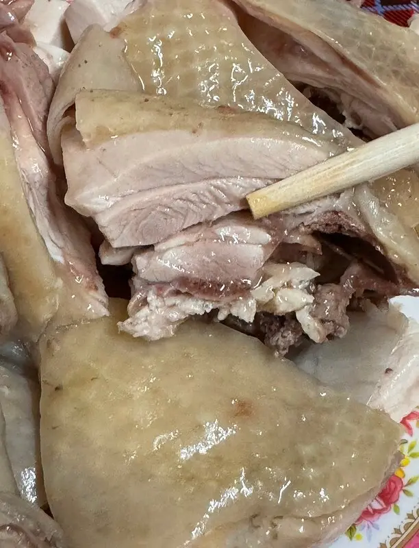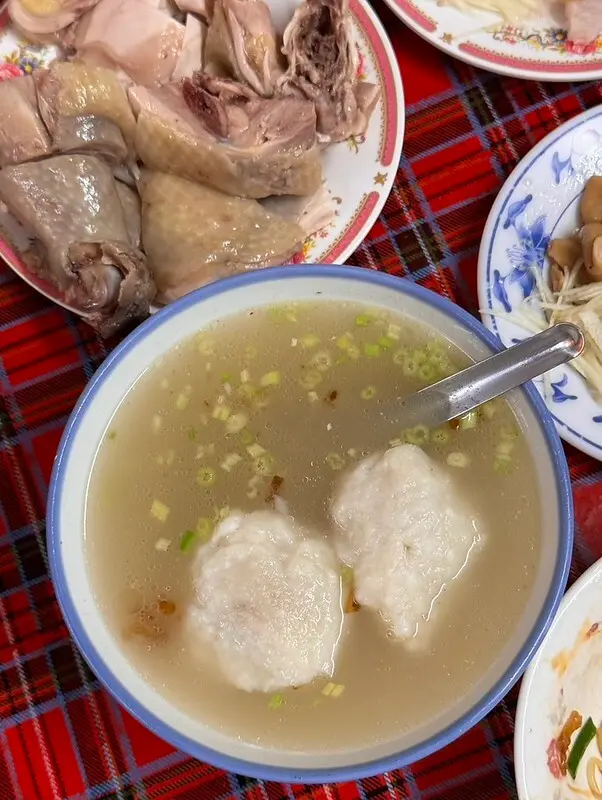 這裡切雞肉是分前後部位的,後腿比較貴,也就是說一隻雞會切成四份。我點了後腿的1/4,切好後滿滿一盤。別問我多少錢,因為我也沒問,反正最後結帳是350元,包含這一盤雞肉、一碗乾麵、一碗福州魚丸湯、一盤滷大腸和一盤三層肉。我都懷疑是不是婆婆算錯了,這價格真的是佛心來著。