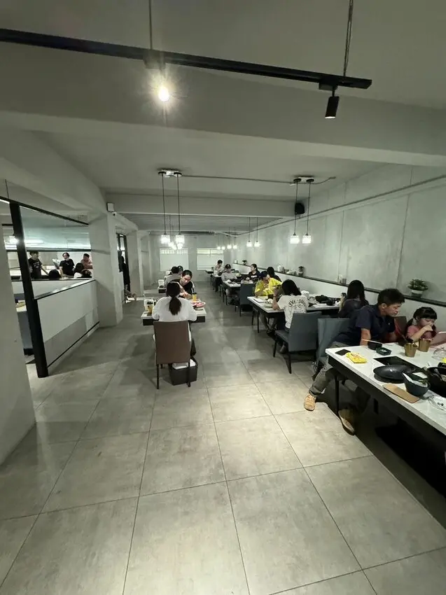 二樓用餐區以灰黑白為主色調,牆壁與地板採仿清水模設計,營造出平衡和諧的氛圍。這裡還設有多個半開放式包廂,非常適合家庭聚餐或商務聚會。