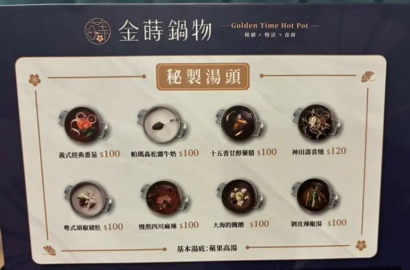 - 不辣湯頭:義式經典蕃茄、帕瑪森松露牛奶、十五香甘醇藥膳、神田壽喜燒、大海的饋贈、蘋果高湯。