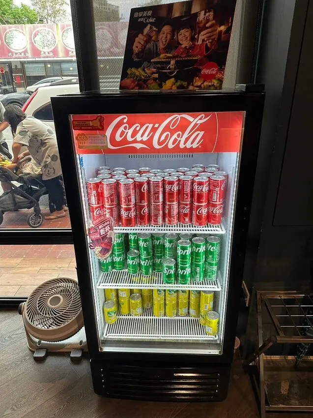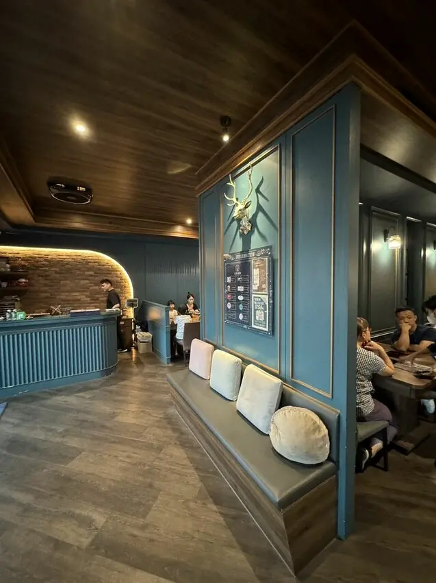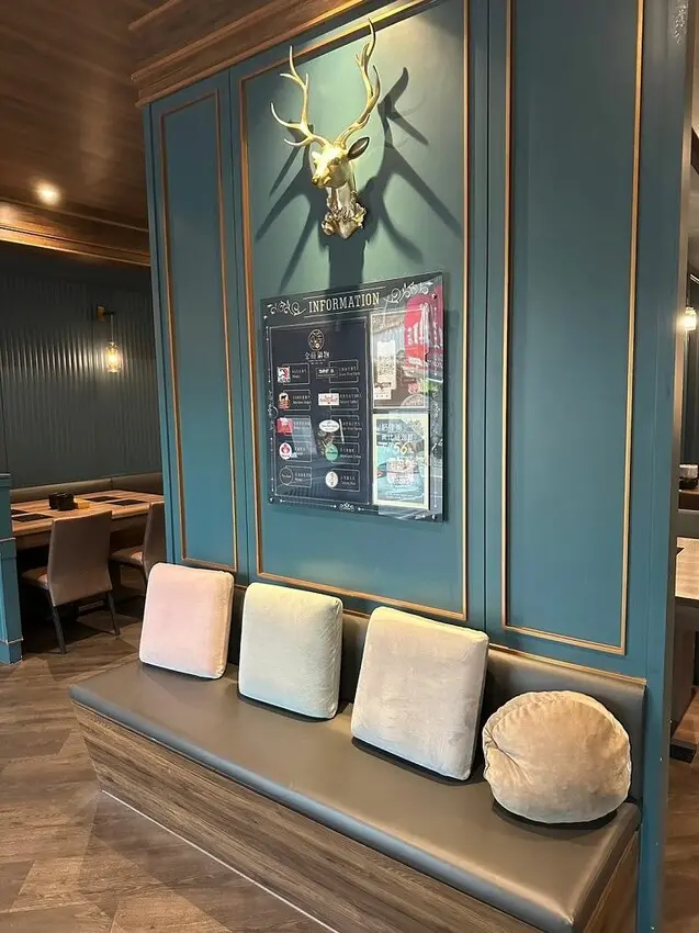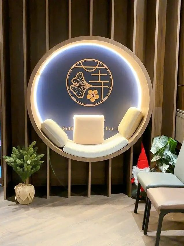 金蒔鍋物的店內設計以墨綠色與金色為主調,一進門便可看到舒適的沙發候位區,對面則是滿滿罐裝飲料的冰箱。