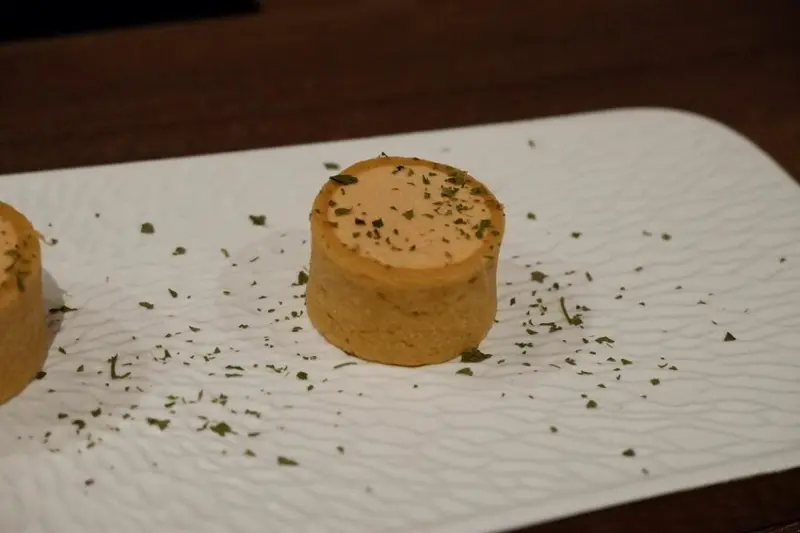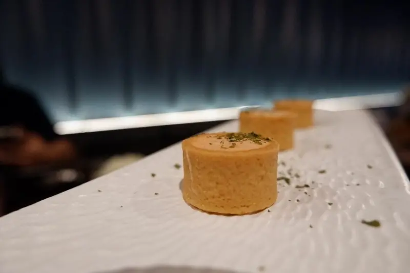 套餐上桌前,服務人員會先送上開胃小點――煙燻鮭魚慕斯塔。酥脆的塔皮搭配濃郁的煙燻鮭魚慕斯,將煙燻香、魚肉香與餅皮奶香完美結合,第一口就讓人驚艷。