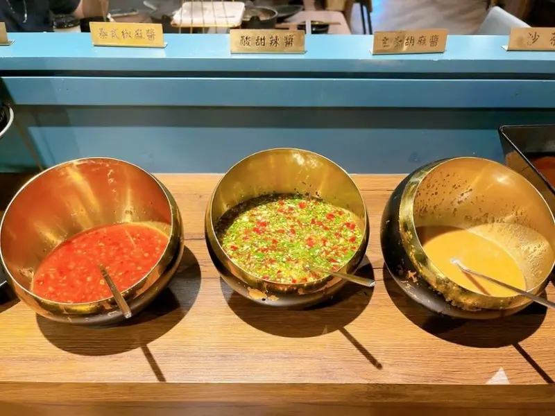 醬料區提供金蒔主廚特調醬料配方,還有現成調好的胡麻醬、酸甜辣醬與泰式椒麻醬。