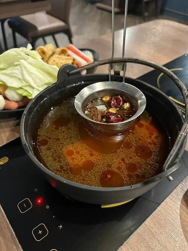 這鍋一上桌,就能感受到店家的用心。湯邊掛著一個網勺,把所有麻辣配料與藥材集中其中,避免料散在湯裡漂浮或沾附食材,這設計真的貼心到不行!