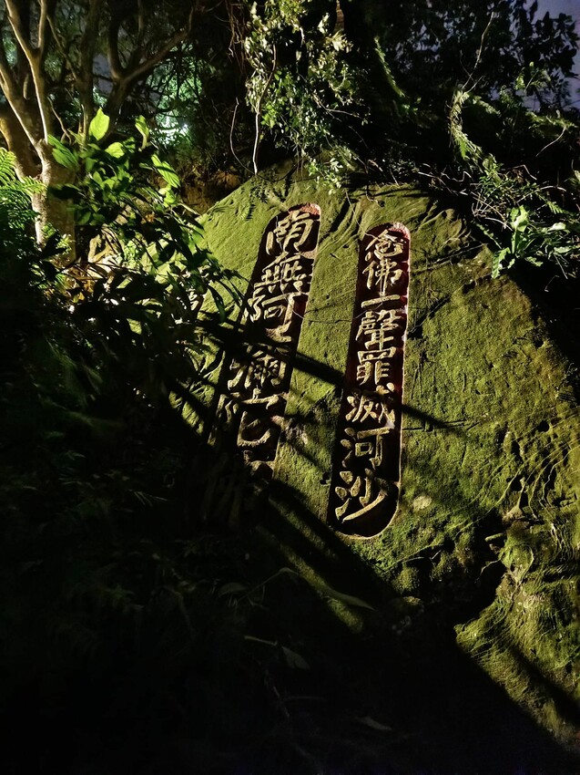 從觀景台下來,我們又去了六巨岩,這裡也是個不錯的拍照角度,刻在大石上的佛號,字跡蒼勁有力,讓人不禁感受到一股佛法的力量。