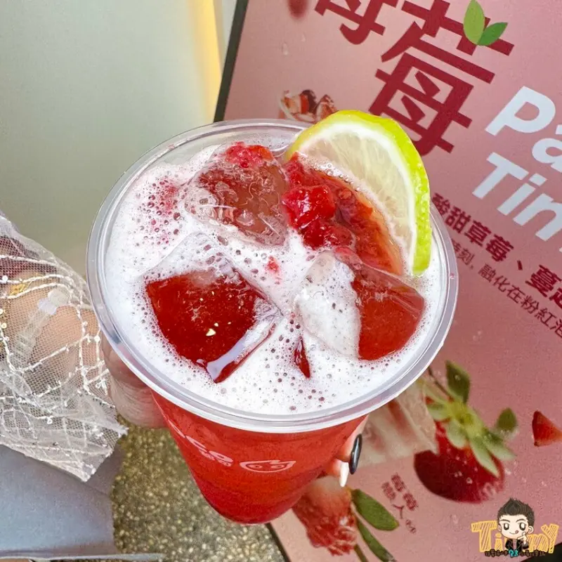 莓莓派對(原價75元)深受女士喜愛,也是冬天第一杯草莓飲料啦!