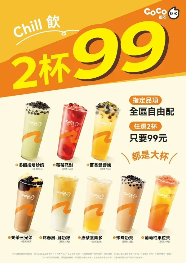 指定品項自由配,任選兩杯只要99元!(各店活動品項依各門市販售為準)