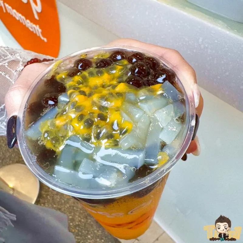 基底是百香綠茶,加上椰果和珍珠,還喝得到百香果籽~