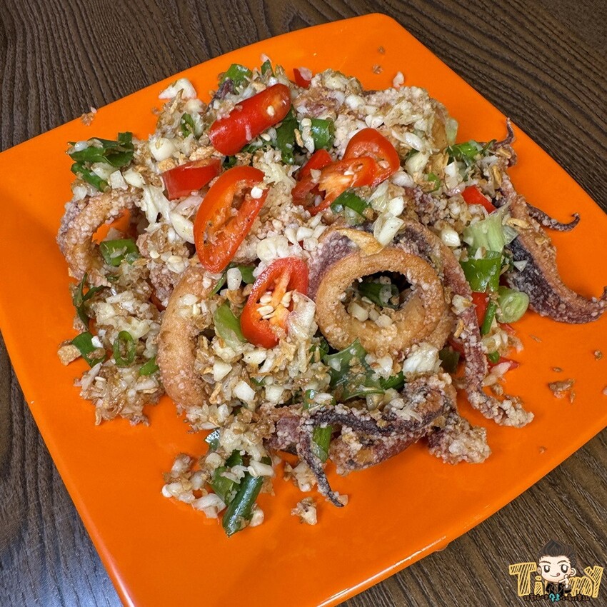 椒鹽魷魚圈(300元)魷魚圈裹粉油炸後,加上胡椒鹽、蔥花和蒜末,一樣很下酒