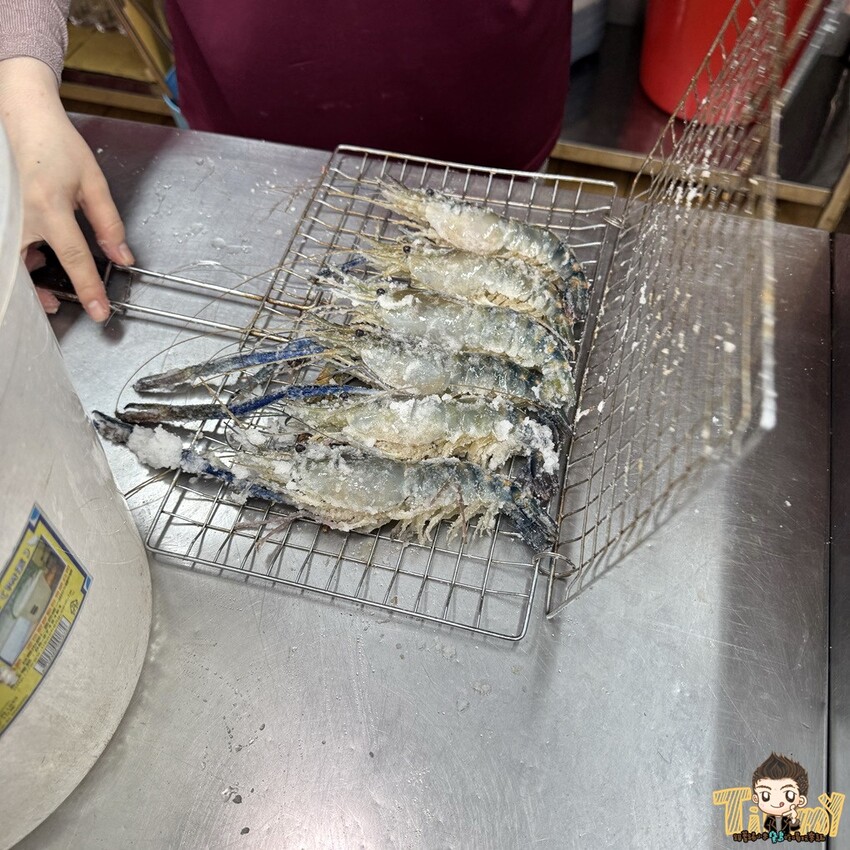 鹽烤蝦使用傳統方法料理,鮮蝦用鹽巴拌勻後,鐵網夾著放進烤爐~