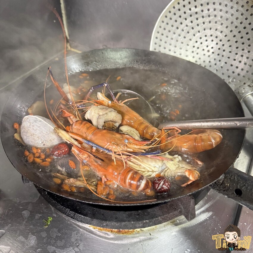 蝦雞鍋使用多種中藥材煮出濃郁的藥膳湯頭後,加入雞肉熬煮讓甜味更濃郁。