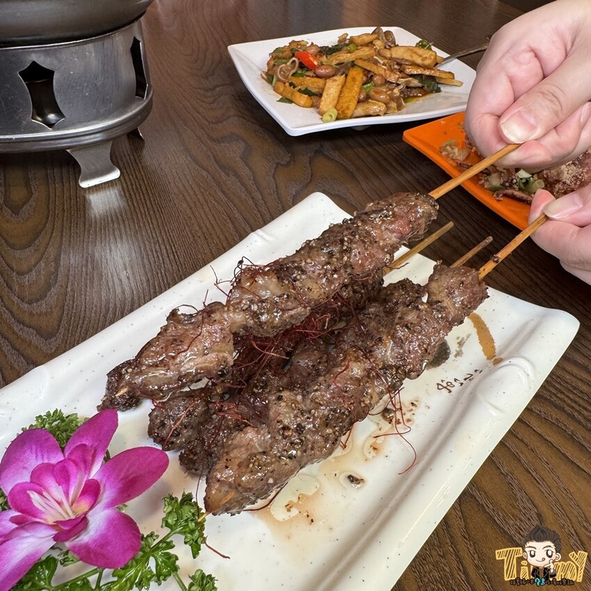 烤牛肉串(250元/5串)建議大家趁熱吃,冷掉會較有嚼勁喔
