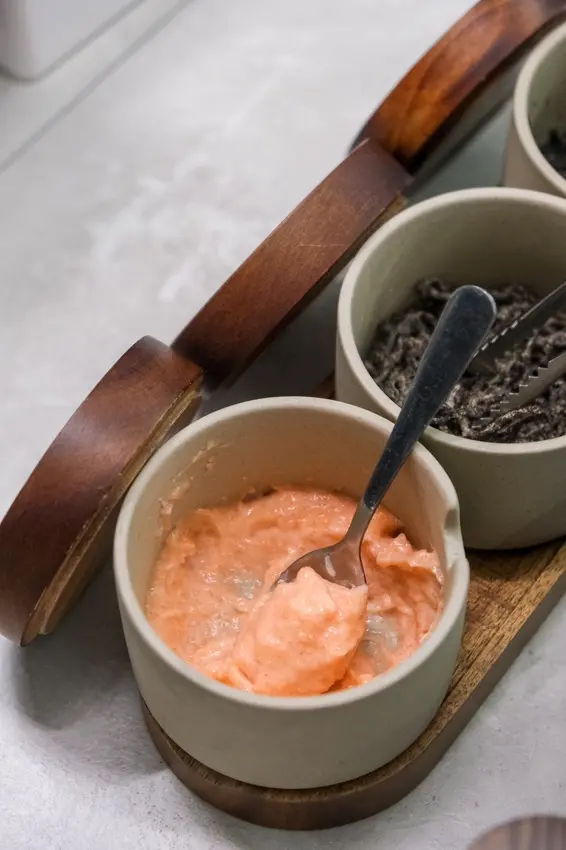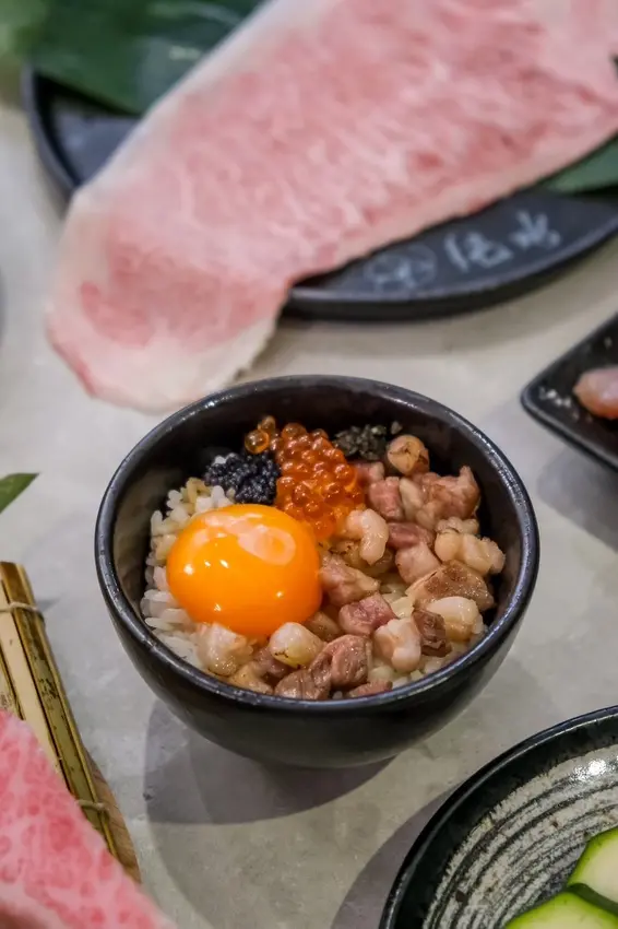 中間放上一顆生蛋黃及松露、鮭魚卵