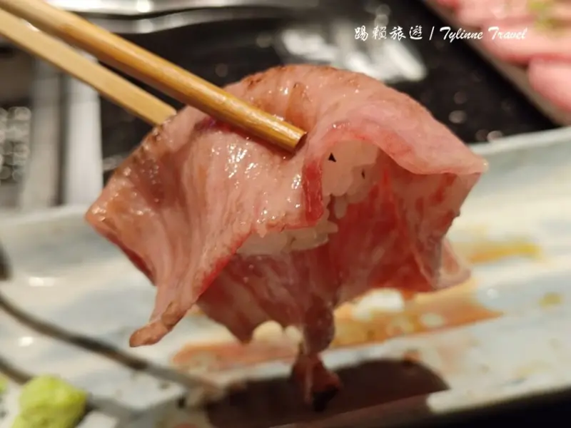 烤完後,將肉片沾上蛋液,吃起來有點像壽喜燒的風味。外層的肉質紮實,而內層依然保持軟嫩彈牙,蛋香與肉香融合得恰到好處。