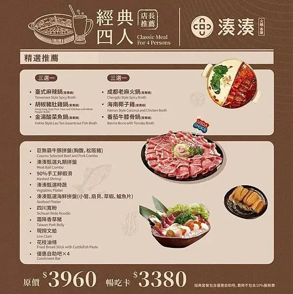 湊湊提供多款湯底選擇,包括鴛鴦鍋、賓士鍋等創新組合。食材有肉品、海鮮、時蔬、火鍋料及手搖飲,選擇豐富。店內提供2人、4人、6人、8人套餐,人均消費約在1000元以內,需另加10%服務費。