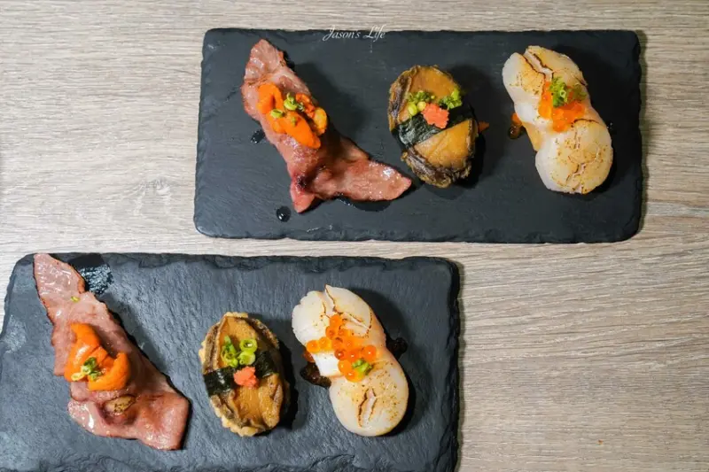 這份握壽司是由壽司師傅在桌邊現場料理的,每一貫都選用新鮮食材,如炙燒和牛、干貝搭配鮭魚卵、以及明太子鮑魚等。這些食材的精心搭配,讓每一口都充滿驚喜與奢華的享受。