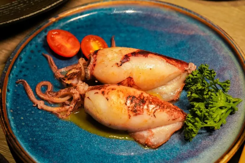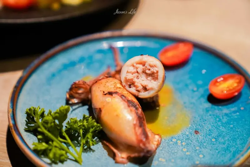 使用新鮮澎湖小卷,內部填入豬肉餡,經過烤製後,外層的小卷Q彈有嚼勁,內餡則充滿肉汁的香氣,兩者結合讓人驚喜不已,是一道不可錯過的創意料理。