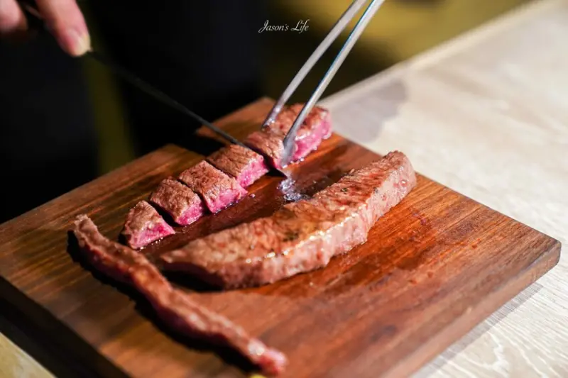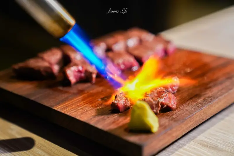 採用澳洲和牛板腱,經過稻草煙燻後,牛排帶有獨特的煙燻香氣。牛排切成一口大小,方便食用,搭配一旁的玫瑰鹽或芥末,更加提升風味層次。