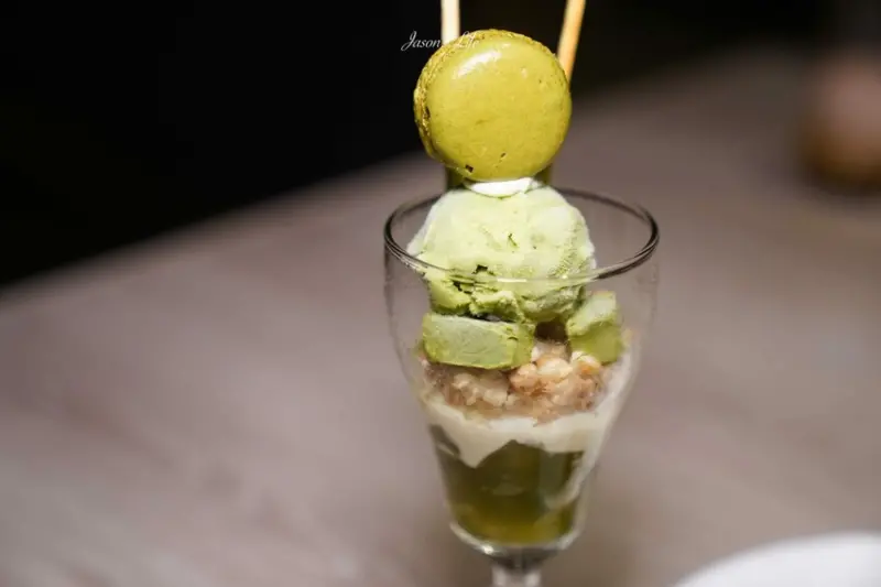 這款甜點靈感來自日式聖代,帕菲由抹茶果凍、抹茶巧克力、抹茶冰淇淋及馬卡龍組成。最底層的抹茶果凍與上層的抹茶冰淇淋相互輝映,搭配中間夾著的榛果碎片,每一口都有豐富的層次感。