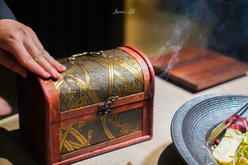 使用來自世界各地的頂級和牛,包括和牛頭刀、A5和牛一品和和牛星星以及和牛舌等,另外附上和牛產地履歷說明,每個部位都獨具風味。寶盒內伴隨著乾冰效果,讓人彷彿置身於魔幻世界中,每片肉的口感都令人驚豔。