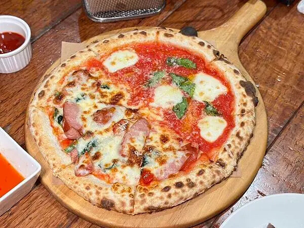 義式手工披薩絕對是薄多義的招牌,強烈建議必點!如果想一次嚐到不同口味,不妨試試雙拼披薩,六種口味任你挑選兩種,味蕾享受加倍!我們這次選擇了「瑪格麗特」和「德式香腸油漬番茄」兩款經典口味。